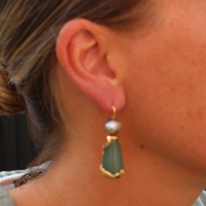 Dit is een set van jade druppels gedeeltelijk bedekt met 24 karaats goud en afgewekt met een grijze zoetwaterparel