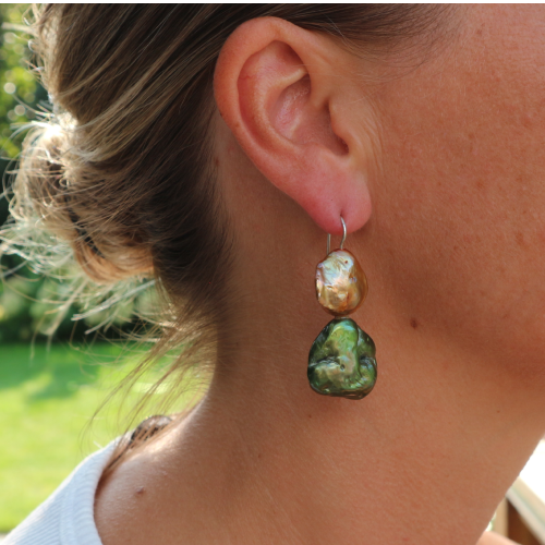 In het wild gegroeide aardegroene zoetwaterparel, gecombineerd met goudkleurige zoetwaterparel. Dit sieraad in aardetinten is afgewerkt met 925 zilveren haken.