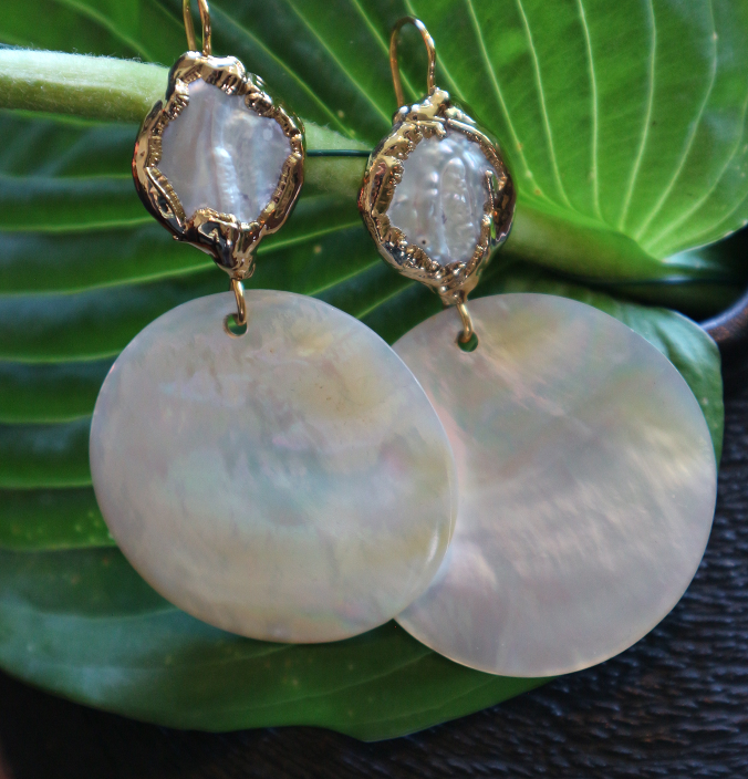 Dit is een witte parelmoerschelp met een witte zoetwaterparel verguld 24KT goud